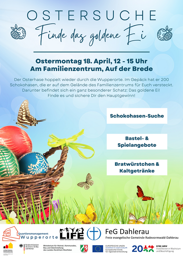 Gemeinsam mit dem Jugendzentrum LIFE und der Freien Evangelischen Gemeinde Dahlerau, verstecken wir viele süße Osterhasen, um euch an Ostern eine kleine Freude zu machen. Schnappt euch am 4. April also eure Eltern, Geschwister oder FreundInnen, macht einen Spaziergang durchs Quartier und haltet ganz besonders gut die Augen auf.